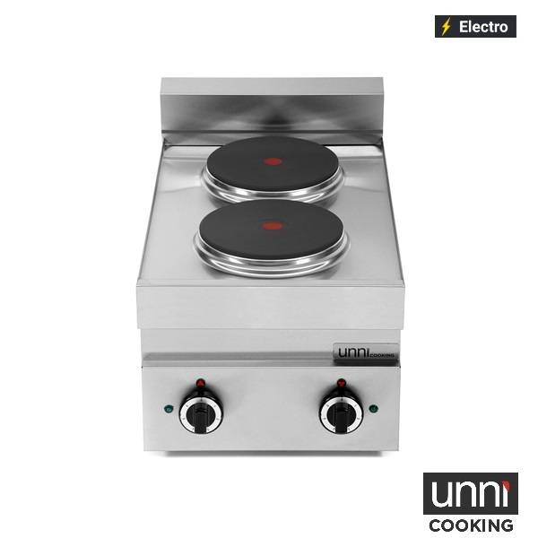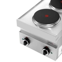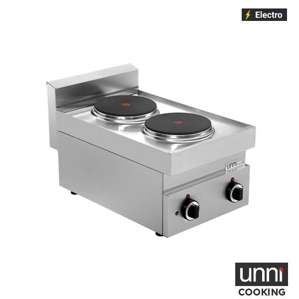 Dit elektrische fornuis uit de 650 SERIE kooklijn van UNNI-COOKING is volledig vervaardigd uit hoogwaardig RVS en uitgerust met twee kookpunten. De kookplaten zijn onafhankelijk regelbaar met stevige draaiknoppen die beschikken over 6 standen, zodat je altijd optimale controle hebt tijdens het koken.