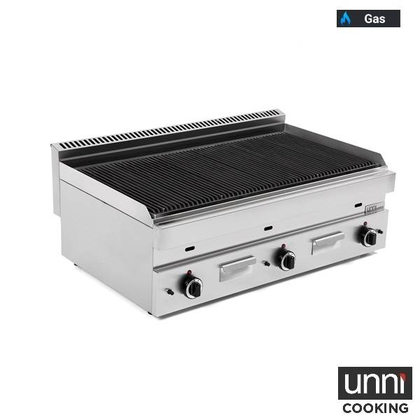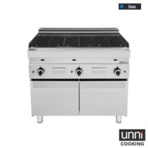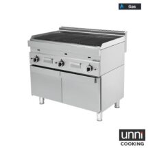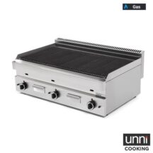 Deze extra grote lavasteengrill op gas uit de 650 SERIE kooklijn van UNNI-COOKING is de perfecte oplossing voor horecakeukens met hoge grillcapaciteit. De behuizing is volledig uitgevoerd in hoogwaardig RVS en de grill is uitgerust met drie robuuste gietijzeren roosters van elk 330 × 500 mm, waarmee je gelijktijdig grote hoeveelheden vlees, vis of groenten efficiënt en egaal kunt grillen.
