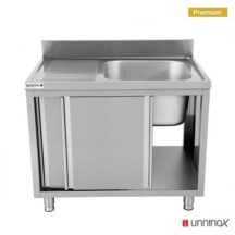 De achteropstaande rand van 100 mm voorkomt dat water of vuil achter de tafel terechtkomt. Dankzij de dubbelwandige schuifdeuren heb je snel en gemakkelijk toegang tot de opbergruimte onderin, terwijl het geluidloze schuifsysteem zorgt voor extra comfort in drukke keukens.