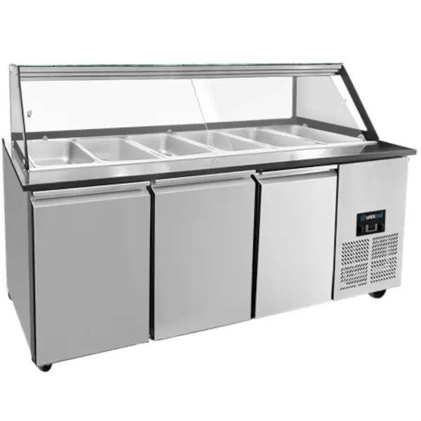 Deze saladette beschikt over drie zelfsluitende deuren en biedt ruimte voor vijf 1/1 GN-bakken (tot 150 mm diep) onder de glazen opzetvitrine. Dankzij de automatische ontdooiing en digitale temperatuurregeling is bediening eenvoudig en onderhoud minimaal. De zwenkwielen met remmen maken het apparaat gemakkelijk verplaatsbaar en zorgen voor een hygiënische reiniging van de werkruimte.