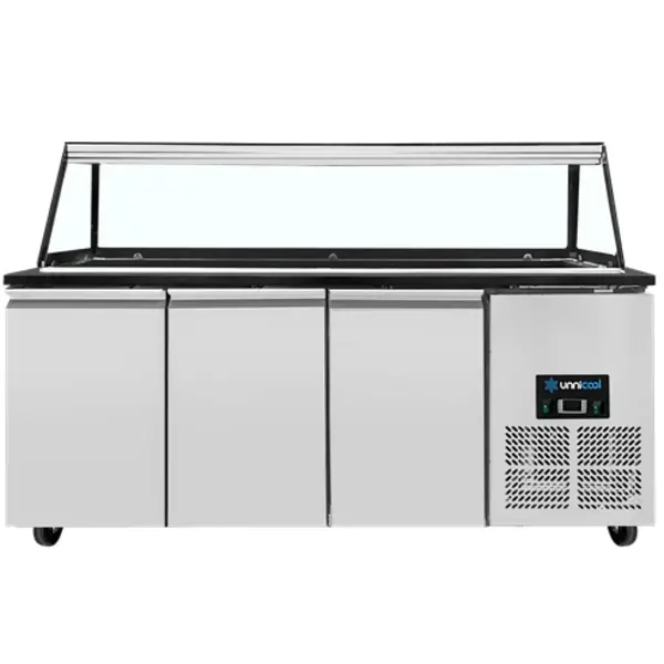 De UNNICOOL luxe saladette met houtpanelen en zwart granieten werkblad biedt de perfecte balans tussen stijl, kracht en gebruiksgemak. Deze hoogwaardige koelwerkbank is speciaal ontworpen voor de professionele horeca en combineert een luxe uitstraling met betrouwbare prestaties — ideaal voor het bereiden en presenteren van verse ingrediënten.