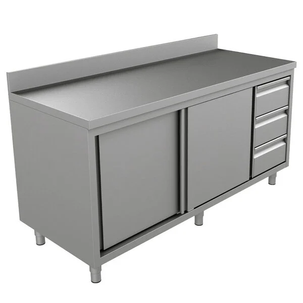 De geïntegreerde onderkast met schuifdeuren en tussenschap biedt ruime opbergmogelijkheden. Aan de rechterzijde bevinden zich 3 praktische laden voor het netjes en stofvrij bewaren van gereedschappen, ingrediënten of schoonmaakartikelen.