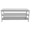De werktafel is volledig uitgevoerd in hoogwaardig roestvrij staal en voorzien van twee vaste bodemschappen. Dit biedt extra opbergruimte voor keukengerei, kratten of schoonmaakmaterialen. De gladde oppervlakken maken schoonmaken eenvoudig en hygiënisch.