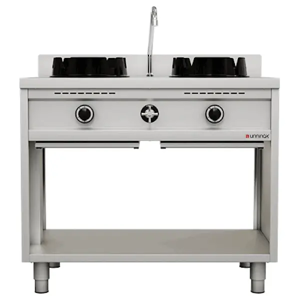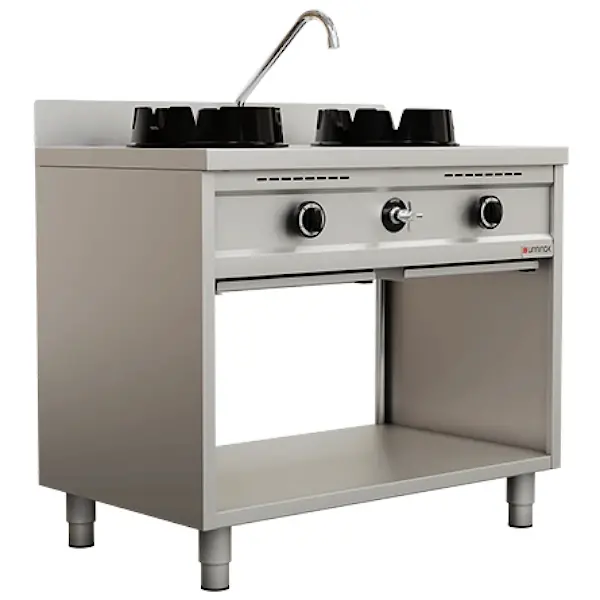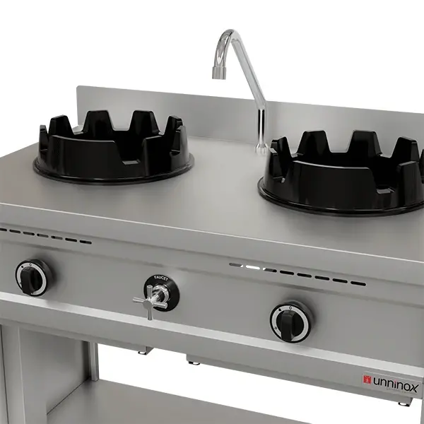 De professionele wokfornuizen van UNNINOX zijn leverbaar met 1, 2, 3 of 4 krachtige wokbranders. Alle uitvoeringen zijn geplaatst op een open onderkast en voorzien van één of twee geïntegreerde waterkranen in het bovenblad, waardoor ze perfect geschikt zijn voor intensief gebruik in professionele keukens.